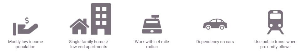 The people in East Hollywood are mostly of the low-income category. They live in either small rented single family homes or low end apartments. Most of them work within a 4 mile radius. They are dependent on cars and use public transit only when the proximity allows.